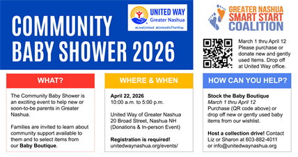 To learn more about the Community Baby Shower and Day of Caring, please visit the United Way of Greater Nashua: https://unitedwaynashua.org/event/community-baby-shower-day-of-caring/
