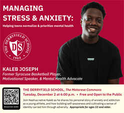 Join Nashua native Kaleb Joseph as he shares his personal story of anxiety and addiction as a young athlete, and how building self-awareness and cultivating a sense of identity carried him through adversity. Appropriate for ages 11 and older.